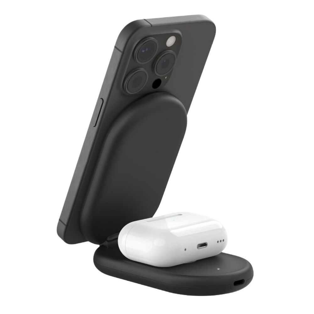 Obtén una carga inalámbrica rápida de 15 W para tu iPhone 16/15/14/13/12 y de 5 W para tus AirPods con nuestra práctica base de carga plegable compatible con MagSafe. Gracias a la tecnología Qi2, la base de carga ofrece una conexión magnética segura y alineada para el iPhone y hasta el doble de velocidad de carga.
